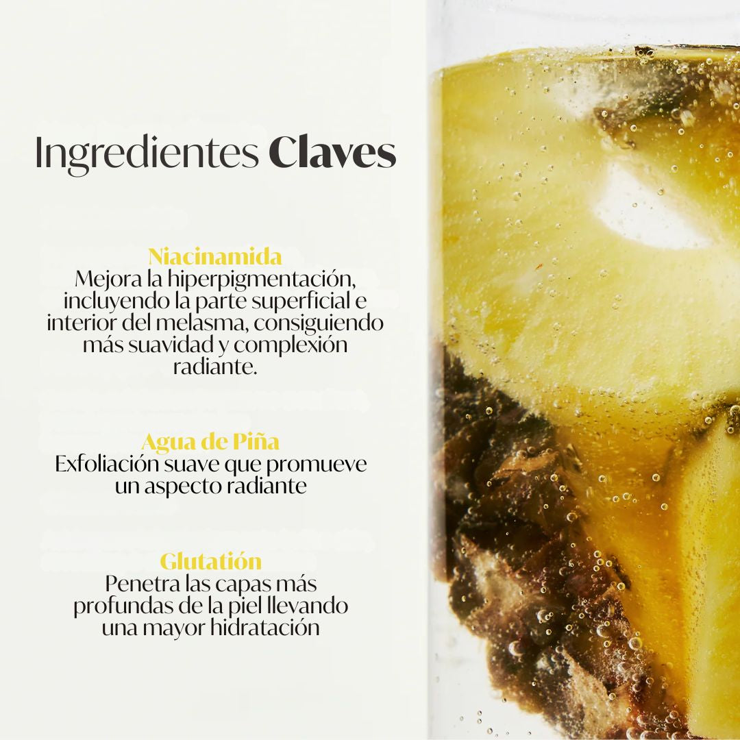 Sus ingredientes incluyen niacinamida y glutatión de alta pureza, que ayudan a atenuar el melasma, la hiperpigmentación y las manchas oscuras, logrando un tono de piel más uniforme.