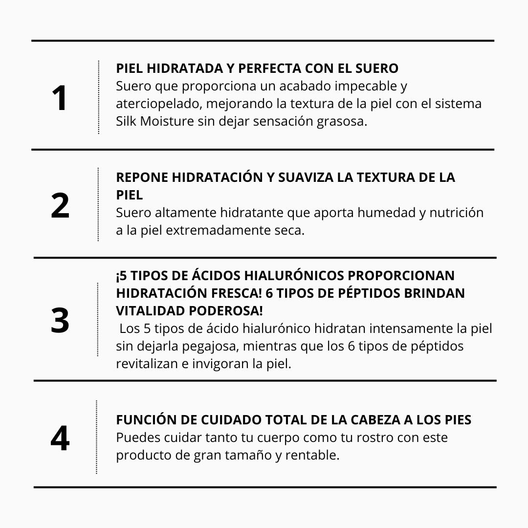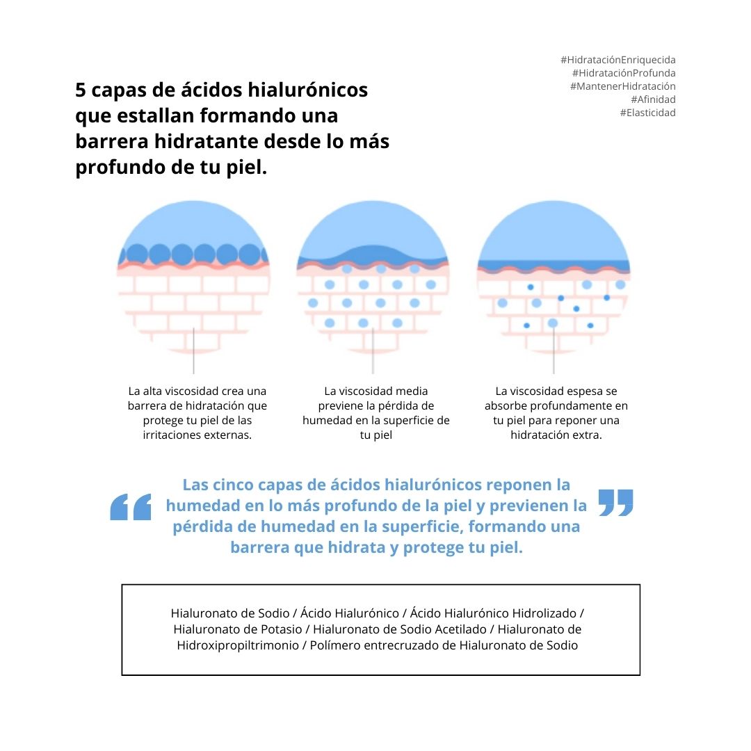 - Seis tipos de Péptidos: Reafirman, hidratan, nutren y fortalecen la barrera de la piel, mejorando su textura y apariencia general.